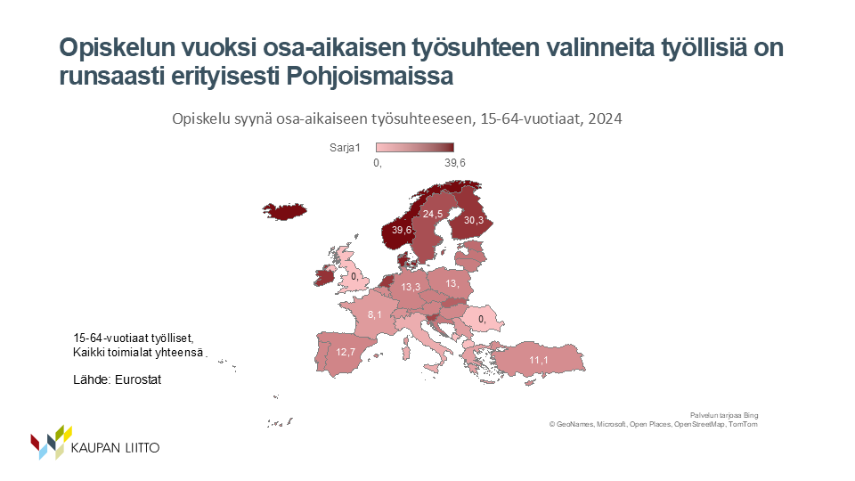 Opiskelun vuoksi osa-aikaisen työsuhteen valinneita työllisiä on runsaasti erityisesti Pohjoismaissa